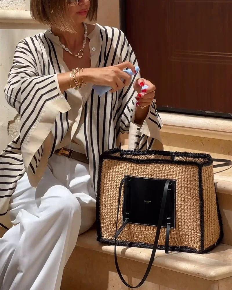 De Sasha Geometrische Gestreepe Gebreide Top is een opvallend kledingstuk ontworpen voor wie een eigentijdse stijl met een comfortabele pasvorm waardeert. Deze unieke top heeft gedurfde geometrische strepen die een boeiend visueel effect creëren, terwijl het relaxte, asymmetrische silhouet een moderne twist toevoegt. Gemaakt van een zachte, ademende gebreide stof, biedt het een luxueus gevoel en een comfortabele val, waardoor het perfect is voor stijlvolle casual uitjes of om een artistiek tintje toe te voegen aan je smart-casual garderobe.